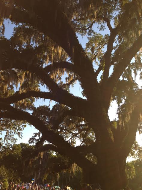 Isley was staring up into the branches of a large-limbed live oak tree. Head cocked way back.Very tall tree. Very small girl.