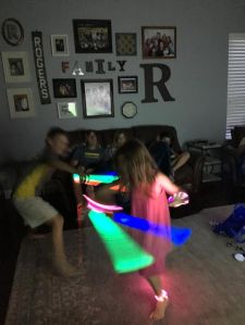 John is brilliant in times of whininess. (He’s dealt with me all these years.) He had some tricks up his sleeve–and a few objects that light up–left over from the summer. He got them out and let the younger ones have at them.