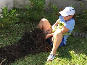 Even with really damp ground, it was a battle. Prying those bushes out of the ground took a team effort. Alone I could barely get the shovel in far enough to loosen their grip. Four of us worked together and managed to pull those resistant things from the ground.