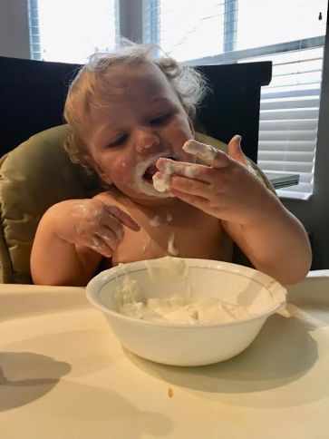 When it came to eating yogurt, a spoon didn’t get it in fast enough. Spoon and hand working in rhythm cut down eating time and increased the mess component exponentially.