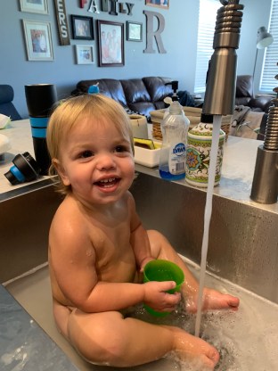 Bliss for a toddler is sitting in a space with water flowing and having the chance to play. With a plastic cup, his ingenuity took over. He poured water on himself, pulled the plug out and replaced it countless times, and managed to squirt me.