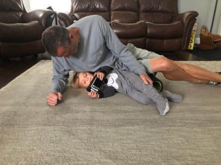 Jeremy has to exercise his leg because of ongoing pain. Prostrate on the floor, stretched out so he can roll his knee to reduce the pain, his position cries out for interactive engagement from his son, who just wants to be up close with his dad.