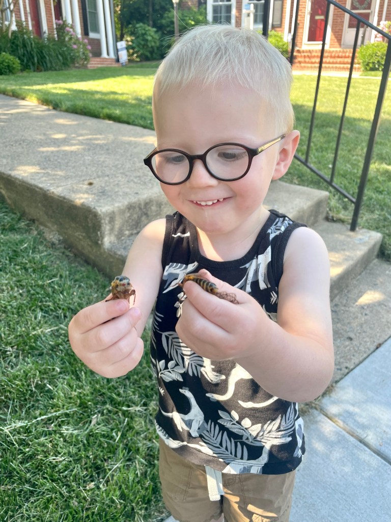 Ward, at three, isn’t afraid or bothered by the plethora of these noisy creatures around his home. He is fascinated with them, and with great courage picks them up and plays with them. They’re his friends.