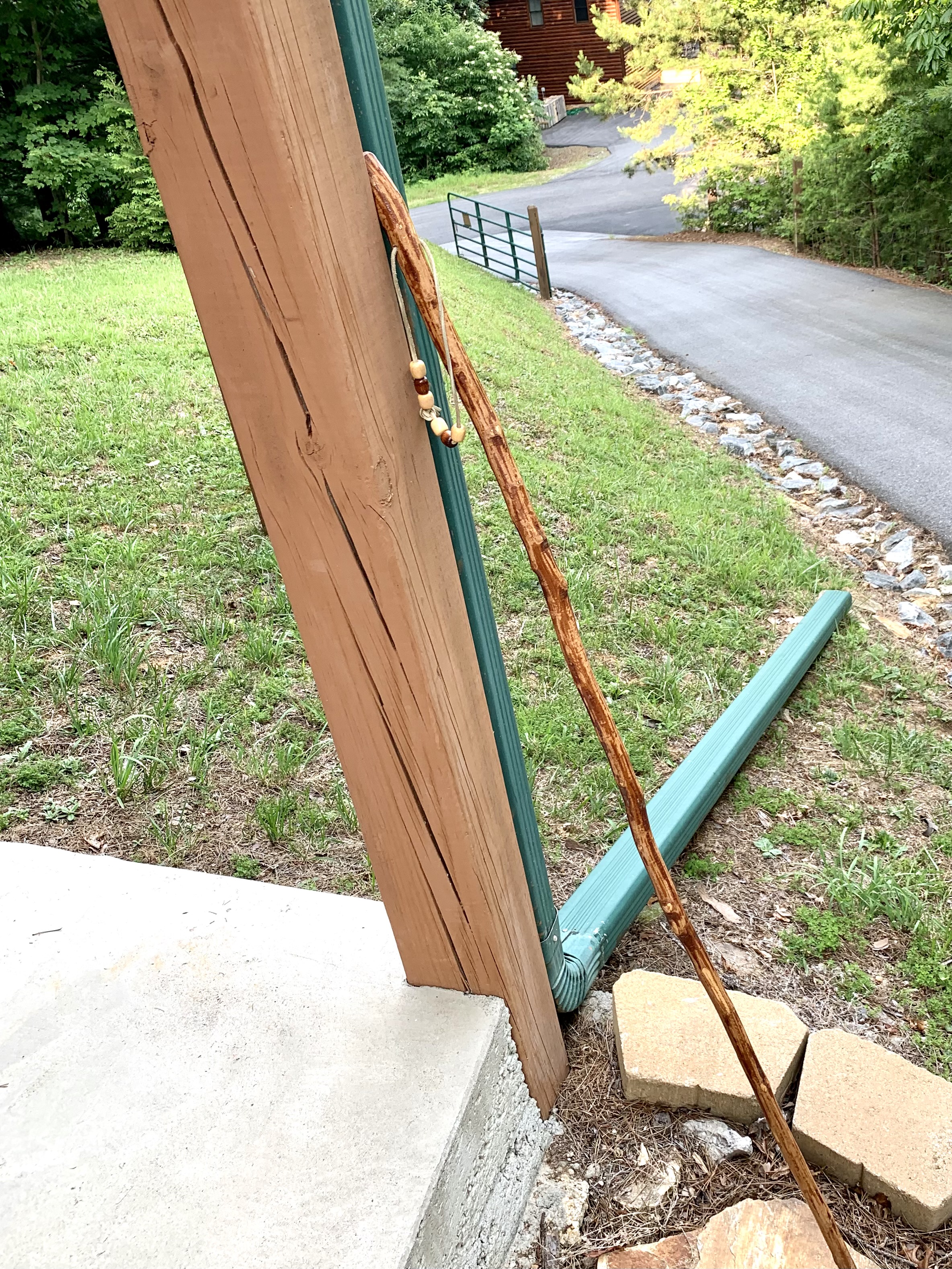 He needs a walking stick to help him keep his balance on the steep inclines.