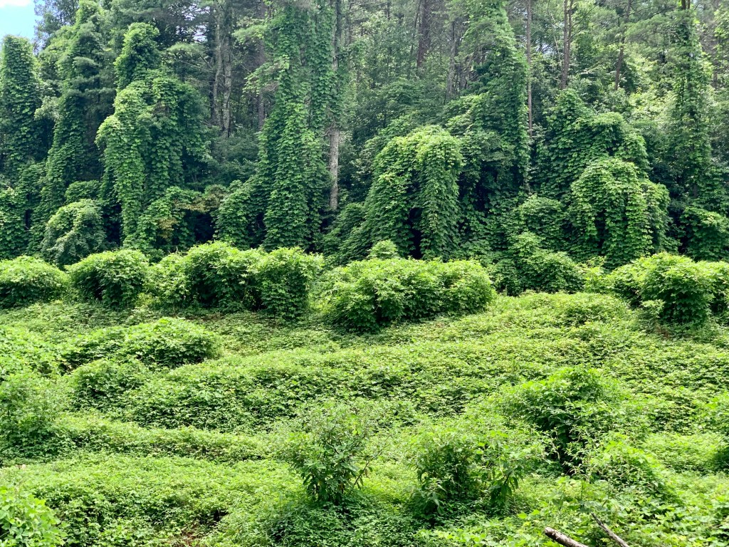Kudzu lives in sunny places–it can’t survive in deep forests. And the Japanese kudzu bug–it is real–loves to suck the very life out of these vines.