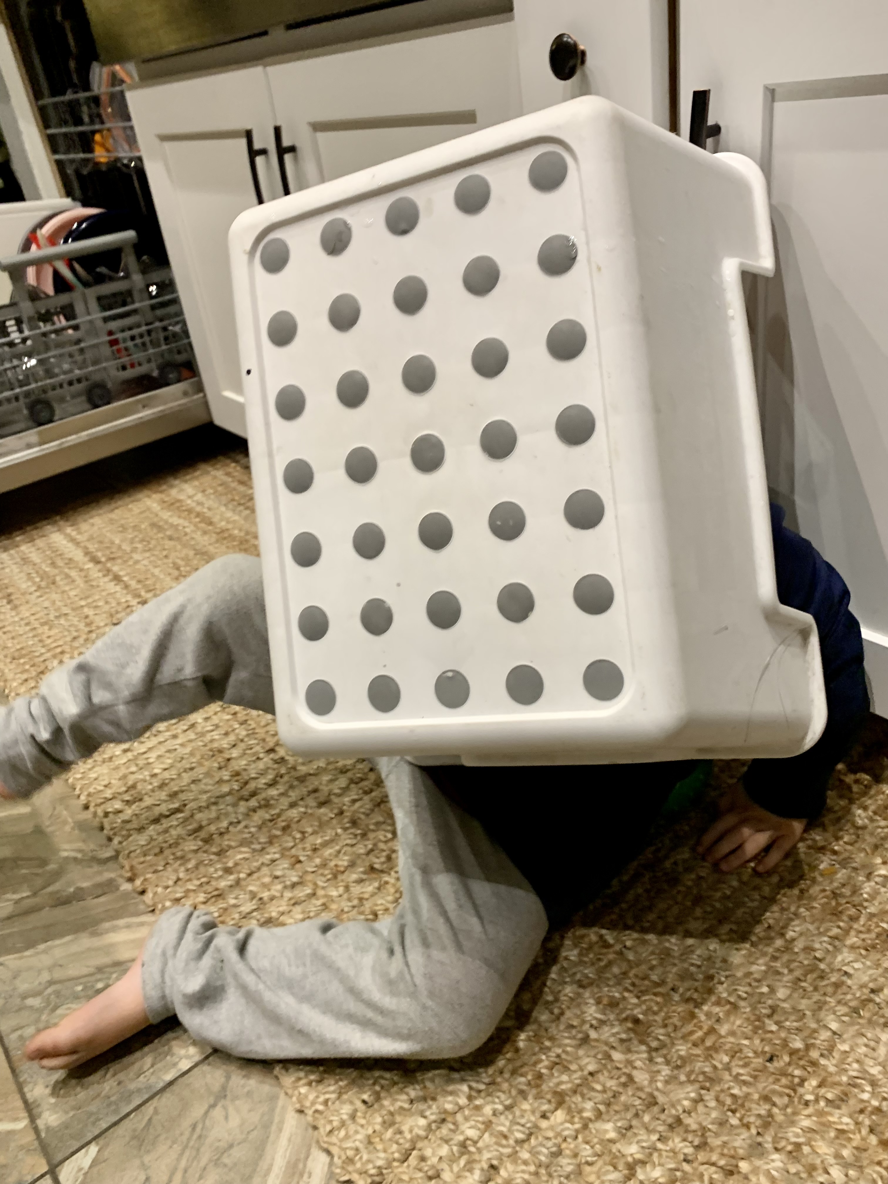 They hid in the pantry, behind chairs, in John’s office, and under benches. Cal, frustrated with all the good hiding places taken, found a stool and tried to become invisible to those around him.