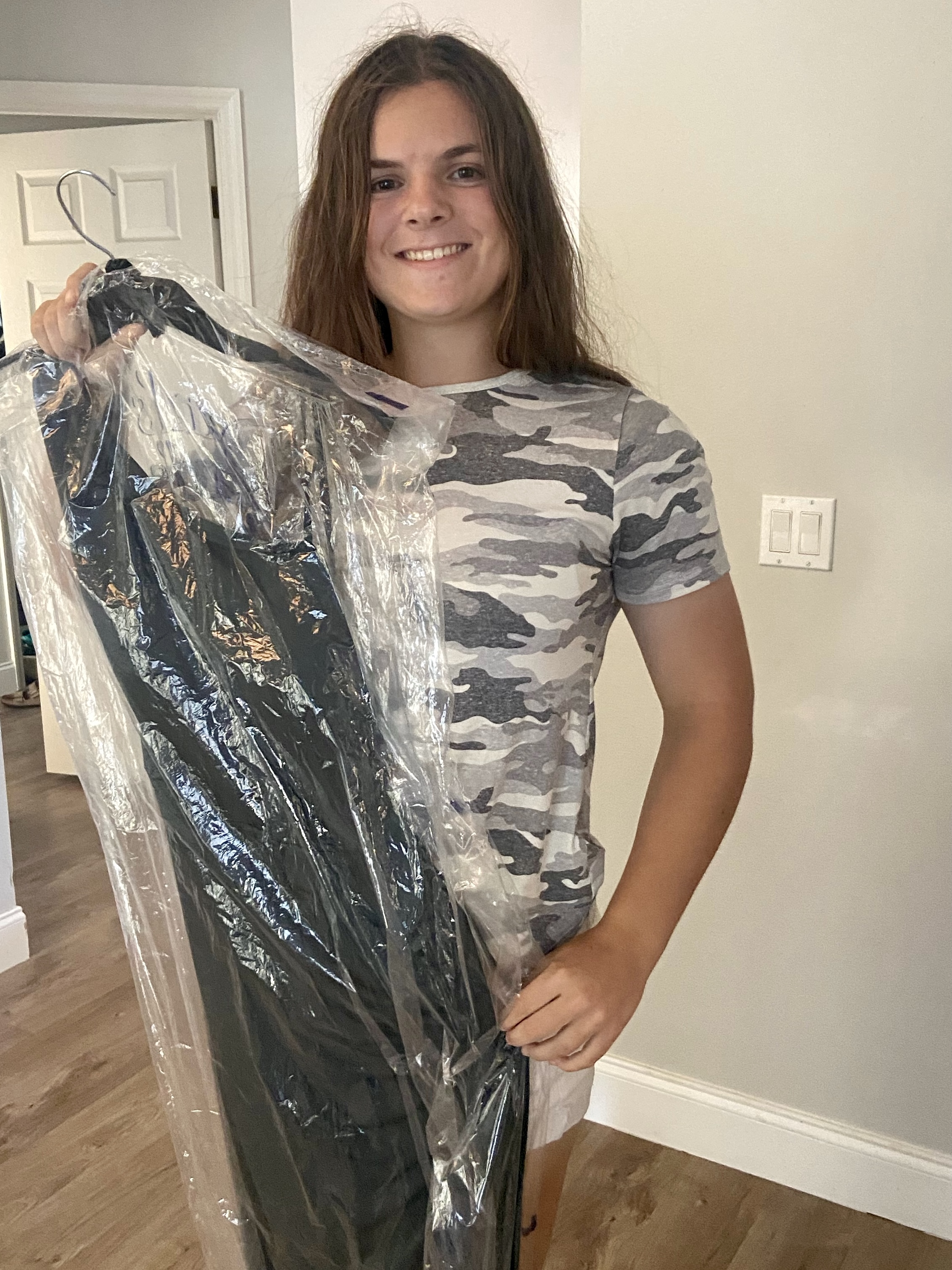 Several dresses were chosen for Sydney to try on, jewel-toned and deep colors. As she tried each one on, I was amazed–every one of them looked great on her. She finally chose a long dress in deep forest green.
