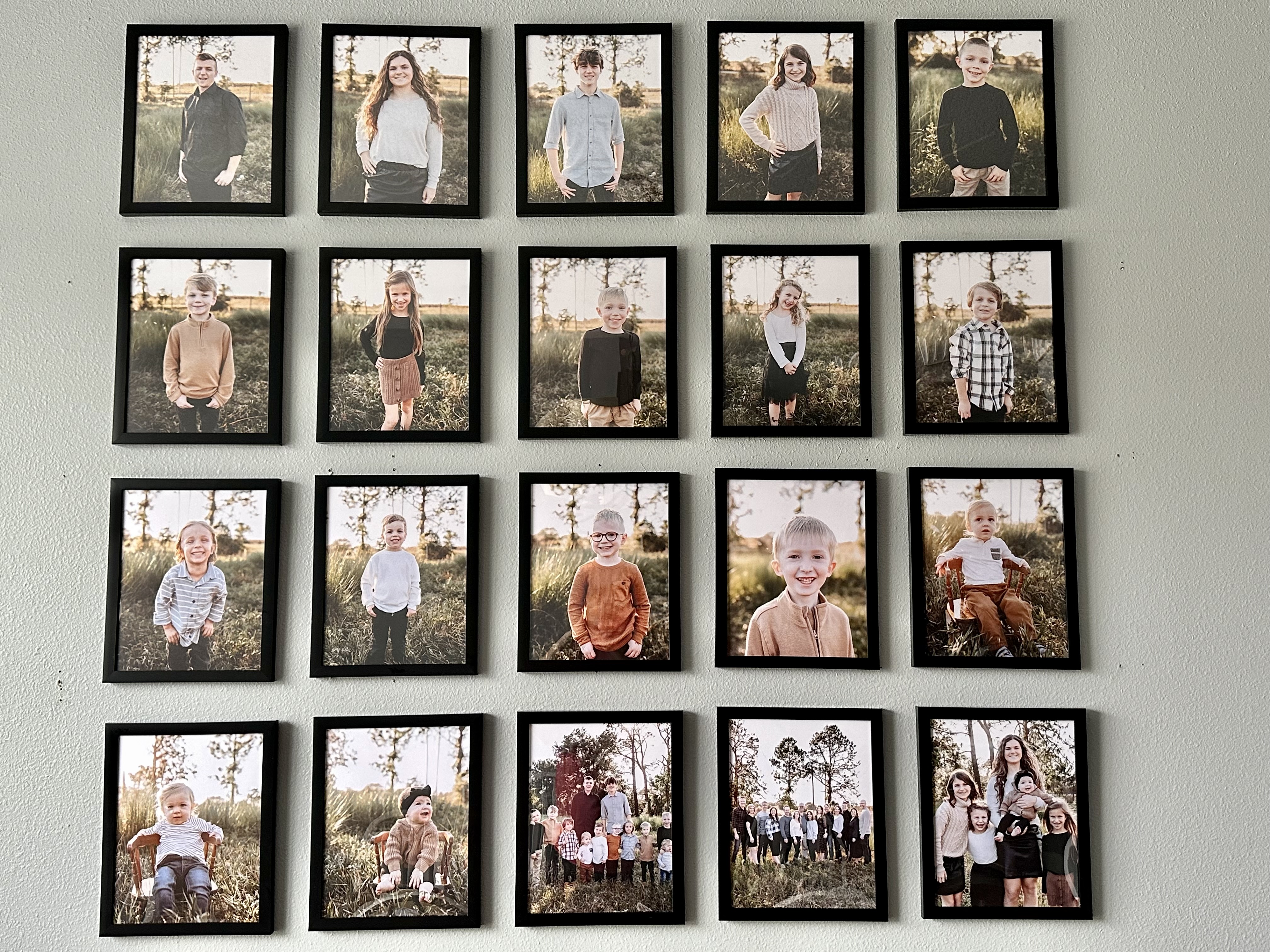 Eleven months later, we finally put up a collage of our grands. All seventeen of them. We evened out the setting with a picture of all the girls, all the boys, and all the couples.