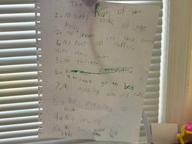 When my daughter, Melody, went up to Sloane’s room the other day, she was confronted by a determined daughter who had created rules for her room–and for those who would choose to enter in.