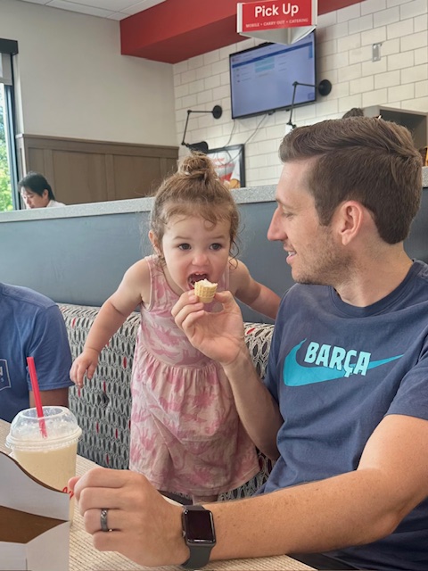 It had been an incredibly hot day, so we stopped for ice cream afterward. Two-year-old Kolly discovered that making her requests knows–loudly–encouraged her dad to offer her ice cream.