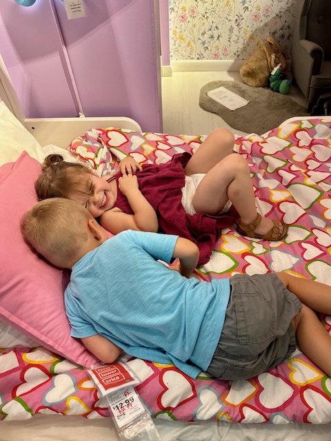 Nolan, a year older, grinned ear to ear and hopped in to prove he could fit just as easily. “I want this bed, too.”