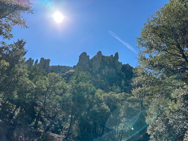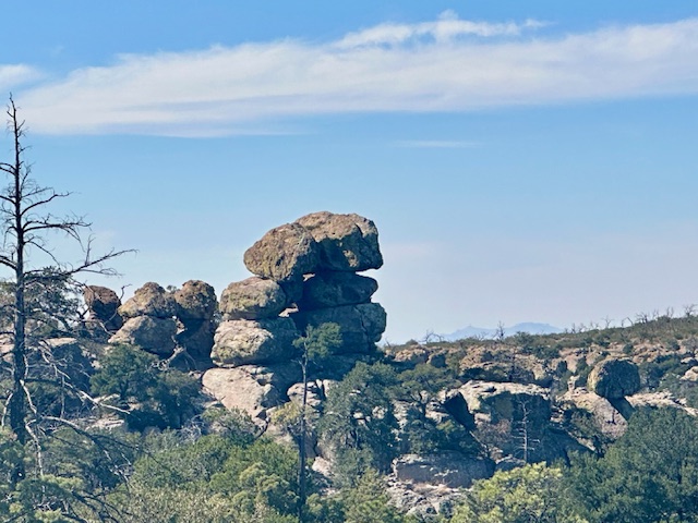 We drove far to the southeast of Arizona to see the Chiricahua National Monument, a place of incredible beauty and the homeland of the Chiricahua Apaches since the early 1400s. It’s called the land of “Standing Up Rocks” because of the unusual formation of the rocks caused by volcanic activity many centuries ago. When you see them from a distance, it appears they are the pipes of a huge pipe organ, spired and sculpted by time with cracks that look like joints.