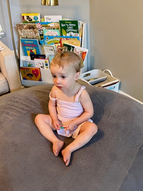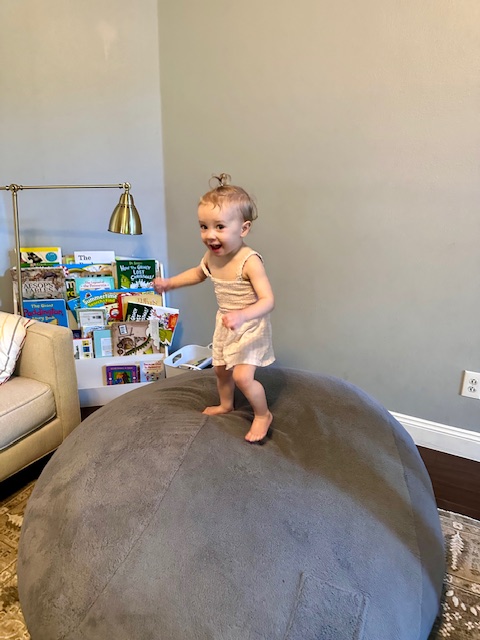 Children reach a certain age and have a strong desire to climb whatever is in front of them, whether a chair, stairs, a toy box, or a bench. Thea has reached this mountain-goat phase, and she’s crawling on anything that poses a challenge. We’ve got these large beanbag chairs in our family room, and she wasn’t deterred by the fact that they’re so much taller than she is.